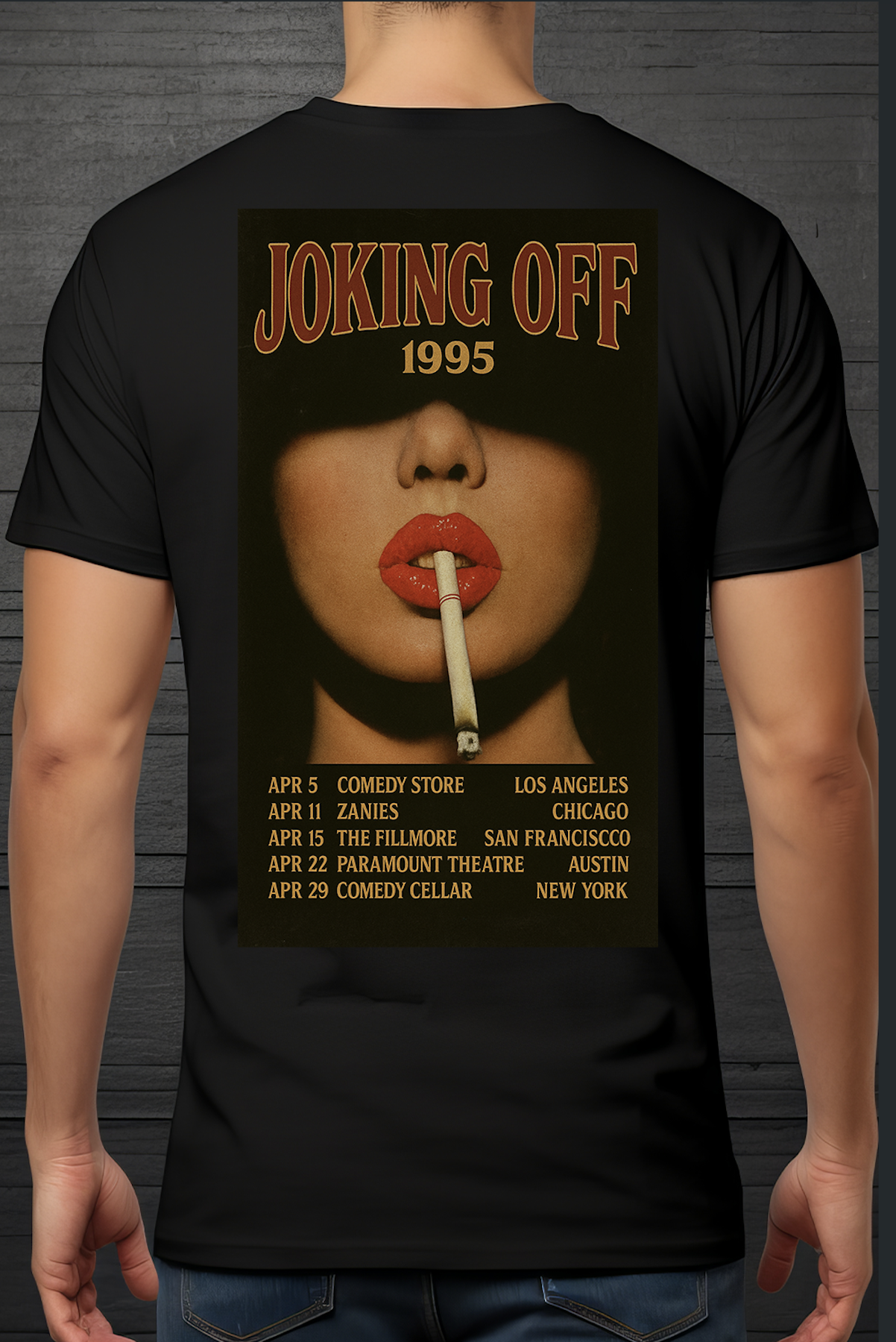 Step into the spotlight with a tee that screams late nights, loud laughs, and bad decisions. The Joking Off 1995 Tour Tee pays tribute to a fake comedy tour that should’ve been real — complete with bold lips, a lit cig, and enough attitude to get banned from most open mics.